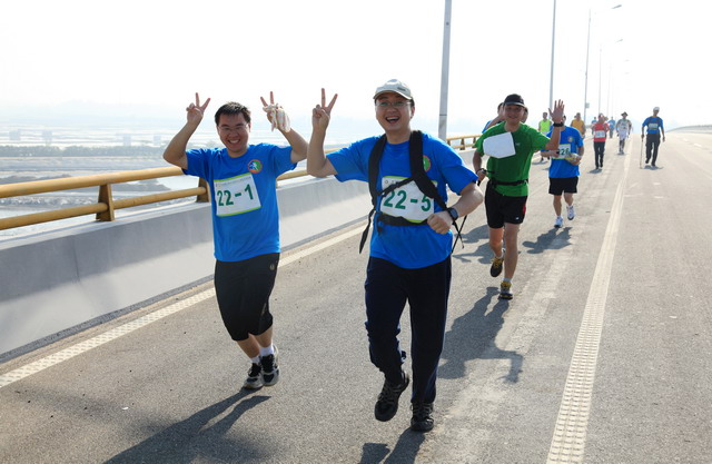 11月5日8時09分,明媚秋光里,廈門市委常委、副市長臧杰斌宣布2011象嶼廈門(翔安)國際百公里縱走挑戰(zhàn)賽開始,廈門市人大常委會副主任黃杰成、廈門市政協(xié)副主席陳昌生、國家奧林匹克體育中心副主任彭維勇、象嶼集團總裁張水利等一起為比賽鳴槍。來自28個國家和地區(qū)的近萬名運動愛好者,從大嶝小鎮(zhèn)·臺灣免稅公園廣場出發(fā),穿越田野、海濱、山巒、閩南古厝,開始了一段挑戰(zhàn)自我的征途。這其中,由象嶼集團員工及家屬、合作伙伴、共建單位等組成的千人象嶼團隊分外引人注目,浩浩蕩蕩的象嶼人走在一起、樂在一起,在欣賞沿途自然、人文風光的同時,也享受著挑戰(zhàn)自我、永不止步的健康向上,享受著與同事、親朋共度美好秋假的怡然歡樂。