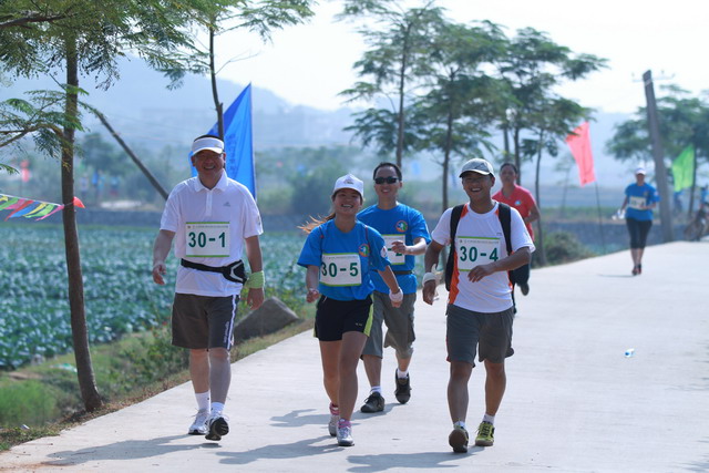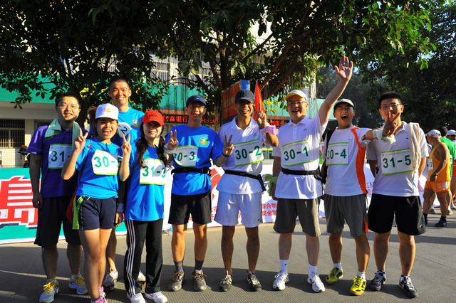11月5日,秋陽燦爛,大家早已躍躍欲試,隊中負(fù)責(zé)后勤的我,早在比賽前夕就廣發(fā)注意帖:速干短褲、帽子、腰包、水杯、小方巾、鞋子等物品需必備;作為隊伍領(lǐng)頭雁的齊總則早已咨詢專業(yè)選手,提倡大家結(jié)合自己體力準(zhǔn)備能量棒、巧克力等緊急能量品;隊長鄧總在了解路線和路況后,制定了“穩(wěn)重取勝”的戰(zhàn)略,采取了“準(zhǔn)備活動做充足,先慢后快求適應(yīng),不因外因亂陣腳,敵疲我追求成績”的具體戰(zhàn)術(shù);隊伍中的另一名隊員則帶來了他專業(yè)的GPS定位手表,分時段匯報所走路程、當(dāng)前速度適當(dāng)與否,并提前告知提速準(zhǔn)備;我們的女隊友亞梅,則一路保持微笑,緊跟隊伍,偶爾爆出的一些冷笑話,讓緊張趕路的我們倍感清爽。