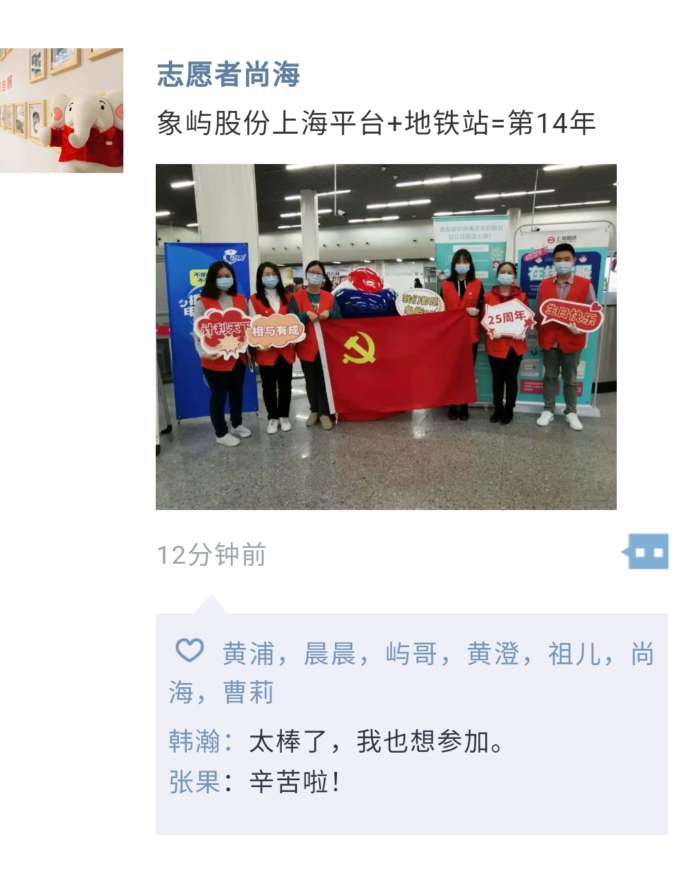 這是象嶼股份上海平臺(tái)志愿者走進(jìn)地鐵站的第14個(gè)年頭。作為城市文明的先行者和宣傳者,志愿者們十四年如一日,堅(jiān)持用真誠主動(dòng)的服務(wù)為出行的乘客送上溫暖,讓“象嶼紅”成為地鐵站里一道亮麗的風(fēng)景線。