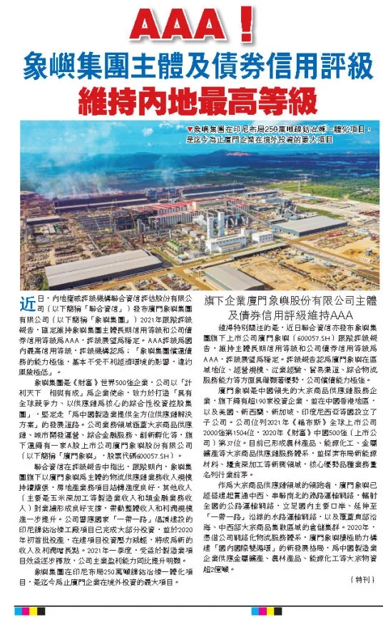 近年來,象嶼積極響應(yīng)國家“一帶一路”倡議,在國際市場開拓、跨境供應(yīng)鏈服務(wù)、國際化運營團隊培育等方面不斷發(fā)力,象嶼國際化程度不斷提升引起了國際資本市場的廣泛關(guān)注。昨天,《大公報》、《香港經(jīng)濟日報》、《大公網(wǎng)》、《經(jīng)濟通》等多家港媒,發(fā)文聚焦廈門象嶼集團有限公司及旗下上市企業(yè)廈門象嶼股份有限公司主體及債券信用評級均維持國內(nèi)最高等級AAA,并詳細圍繞評級報告介紹了象嶼的業(yè)務(wù)板塊和發(fā)展前景。