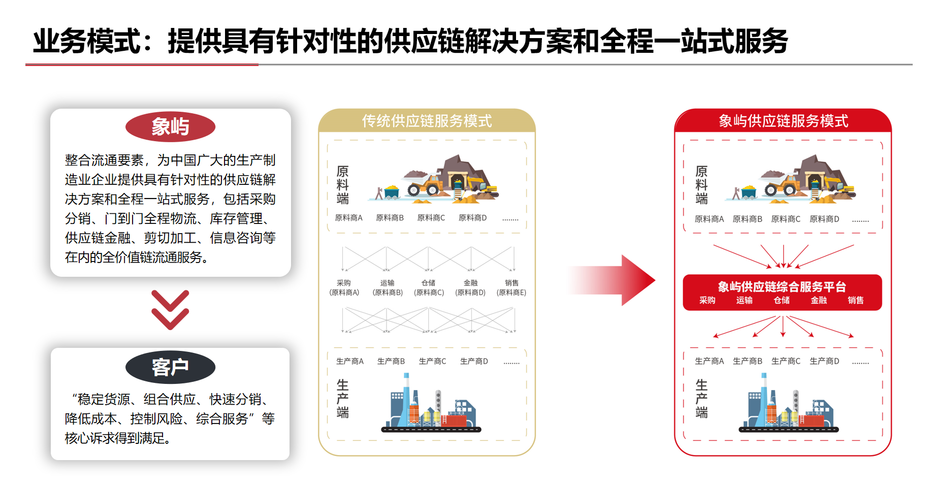 豐富多元、成熟穩(wěn)定的全球化業(yè)務(wù)渠道體系;覆蓋全國、連接海外的網(wǎng)絡(luò)化物流服務(wù)體系;正在構(gòu)建、初步成型的智能化信息科技體系;準(zhǔn)確識別、日趨完善的全面風(fēng)險管控體系;市場化、專業(yè)化的供應(yīng)鏈服務(wù)團(tuán)隊。