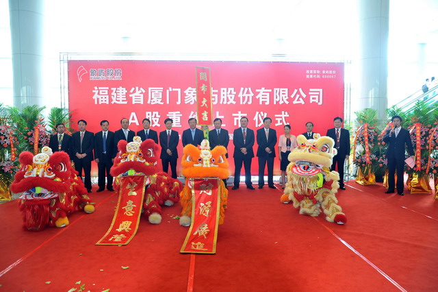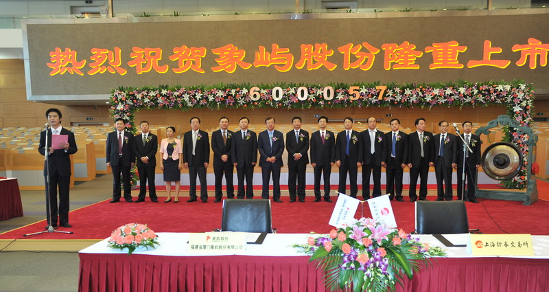 2011年8月29日,福建省廈門(mén)象嶼股份有限公司在上海證券交易所舉行隆重的重組上市儀式。廈門(mén)市人民政府葉重耕副市長(zhǎng)及象嶼股份王龍雛董事長(zhǎng)共同敲鑼開(kāi)盤(pán)。象嶼股份股價(jià)高開(kāi)逾1倍,開(kāi)盤(pán)價(jià)8.25元,早市最高漲127.5%。截至早市收盤(pán),報(bào)8.29元,漲108.29%。